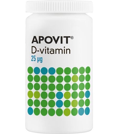 Apovit D-vitamin (D3) er et kosttilskud, som støtter immunforsvaret og vedligeholder muskelfunktion, tænder og knogler. Apovit D-vitamin 25 µg er særligt velegnet til: alle voksne og børn over 11 år, der ønsker et tilskud af D-vitamin eller ved lægeanbefaling. Apovit D-vitamin er uden gelatine, gluten og laktose. Dispenseringsform Tabletter ...