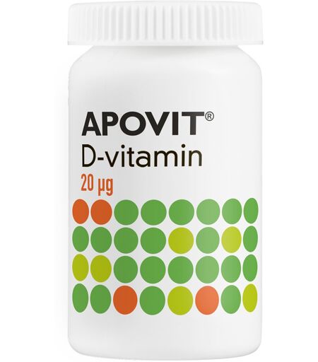 Apovit D-vitamin (D3) er et kosttilskud, som støtter immunforsvaret og er med til at vedligeholde tænder, muskelfunktion og knogler. Apovit D-vitamin er uden gelatine, gluten og laktose. Dispenseringsform Tabletter ...