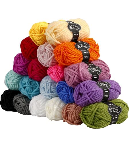 Akrylgarn til strik og hæklingDu får her 20 garnnøgler af tykt garn med 2 tråde af 100 % polyakryl i god kvalitet og forskellige farver. Akrylgarn har mange forskellige anvendelsesmuligheder, er nemt at arbejde med for nybegyndere såvel som erfarne og er velegnet til både strikning, hækling og brodering. Akrylgarn har en høj farveægthed og kan fås i stort set alle tænkelige farver og er kendt for at være slidstærkt og at have en god holdbarhed. Ydermere har akryl den markante fordel at det er et allergivenligt materiale, med en høj åndbarhed og som kan vaskes igen og igen ved 30-40°C uden at det påvirker farven, pasformen og holdbarhed. Derfor er garnet velegnet til at strikke og hækle f.eks. børnetøj og hverdagstøj, boligtekstiler i form af bl.a. tæpper og puder, samt legetøj som f.eks. bamser og dukker.Du får her akrylgarn i maxi tykkelse, som er tykkere og mere vamset end akrylgarn i standardtykkelse. Garnet er dobbelt så tykt som normalt og er meget populært blandt strikkere der ønsker at begive sig ud i strikkeprojekter hvor der skal være lidt mere gods i. Sampak med 20 garnnøglerFarve: AssorteretMateriale: 100 % polyakryl fibreVægt pr. garnnøgle: 50 gLængde pr. garnnøgle: 35 mStrikkefasthed (10x10 cm): 11m x 16p på pind nr. 9Kan vaskes i maskinen ved 30-40°C ...