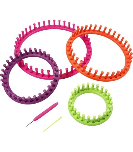 Sæt med runde strikkeringeDu får her et fint startsæt med 4 runde strikkeringe i plast, i forskellige farver og størrelser. Hver størrelse har sin egen farve, så det er hurtigt og nemt at finde præcis den ring du skal bruge. Strikkeringene er simple at bruge, da du ikke behøver at kunne strikke i forvejen, så de nemt kan benyttes af alle – selv børn og nybegyndere.Med strikkeringe undgår du at belaste arme og skuldre, da ringene kan ligge på bordet eller i skødet, mens du strikker og kan bruges til mange forskellige og kreative strikkeprojekter. Du kan f.eks. bruge ringene til at strikke sokker, trøjer, benvarmere, halstørklæder, huer, handsker og mange andre spændene ting – kun fantasien sætter grænser. Sættet består af 4 runde strikkeringe i størrelserne 12 cm (grøn), 17 cm (lilla), 22 cm (orange), 27 cm (pink), samt 4 strikkenåle, 4 kroge og en vejledning til brug af ringene. ...