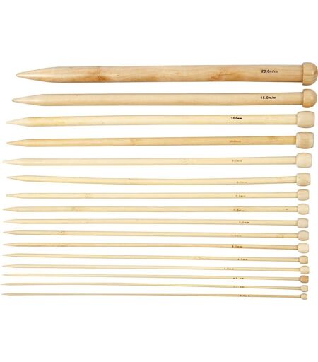 Strikkepinde i bambusDu får her et sæt strikkepinge i god kvalitet. Strikkepindene er 35 cm lange og er fremstillet i bambus, som er et let og glat materiale, så du er sikker på at maskerne glider let og ubesværet henover pindene når du begiver dig ud i forskellige og kreative strikkeprojekter. Strikkepinde i træ er desuden meget behagelige at strikke med, da de opvarmes i hænderne og samtidig næsten er lydløse at stikke med.Mulighederne er uendelige når det kommer til at strikke, men hvilke strikkepinde du bør vælge, afhænger af dine strikkeønsker og behov, samt det garn du strikker med. Råd om valg af pinde er ofte oplyst på strikkegarnet eller på strikkeopskriften. Størrelse: 2,5-20 mm Længde: 35 cmMateriale: Bambus ...