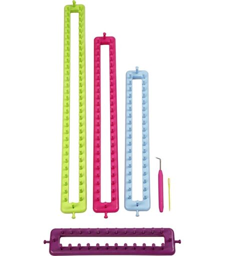 Sæt med aflange strikkeringeDu får her et fint startsæt med 4 aflange strikkeringe i plast, i forskellige farver og størrelser. Hver størrelse har sin egen farve, så det er hurtigt og nemt at finde præcis den ring du skal bruge. Strikkeringene er simple at bruge, da du ikke behøver at kunne strikke i forvejen, så de kan benyttes af alle – selv børn og nybegyndere.Med strikkeringe undgår du at belaste arme og skuldre, da ringene kan ligge på bordet eller i skødet, mens du strikker og kan bruges til mange forskellige og kreative strikkeprojekter. De aflange strikkeringe kan bruges til at strikke både flade stykker og til at strikke rundt. Du kan f.eks. bruge ringene til at strikke sokker, trøjer, benvarmere, halstørklæder, huer, handsker og mange andre spændene ting – kun fantasien sætter grænser. Sættet består af 4 aflange strikkeringe i størrelserne 25 cm (lilla), 35 cm (blå), 45 cm (pink), 55 cm (grøn), samt 4 strikkenåle, 4 kroge og en vejledning til brug af ringene. ...