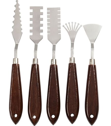 Dekorative malerspatler i metalHer får du et smart og praktisk sæt med malerspatler i 5 forskellige størrelser og designs, som du kan bruge til forskellige kreative formål. Spartlerne har alle paletter i metal og et lakeret træskaft, så de er lette og gode at arbejde med.Antal: 5 stk.Størrelse: Assorteret ...