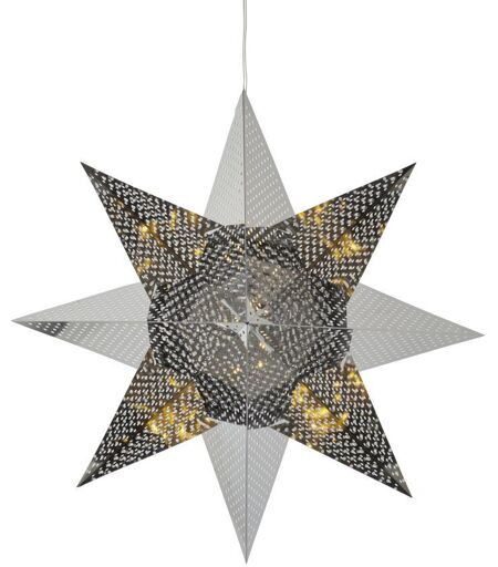 Sirius Lene stjerne Ø: 33 cm + 35 cm - Sølv Den smukke Lene stjerne fra Sirius kan skabe hygge i ethvert rum. Hæng den i et hjørne af rummet og nyd de smukke skygger, stjernens 20 LED lys kaster på væggen. Bemærk Batterier er ikke inkluderet Mål Ø: 33 cm + 35 cm Energikilde 3x AAA Batterier Materiale Metal Farve Sølv ...