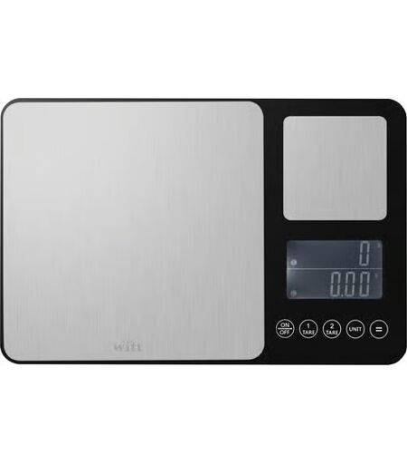 Witt Pizza Køkkenvægt Med den dobbelte digitalvægt kan du veje dine ingredienser helt præcist, så du får den perfekte pizzadej - hver gang! På den lille platform kan du veje den helt korrekte mængde gær, salt eller krydderurter, helt ned til en tiendedel gram. På den store platform kan du veje den færdige pizzadej, så du altid får den ønskede størrelse på din pizza. Det dobbelte LCD-display viser dig den præcise vægt for begge platforme samtidig. Specifikationer: Produkttype: Køkkenvægt Farve: Grå Materiale: Rustfrit stål med anti-fingerprint coating Vægtenheder: kg, g, ml, OZ, lb, oz Vejningskapacitet på den store platform:Maks.10 kg / min. 1 gNøjagtighed: ±0.2%+1 g Vejningskapacitet på den lille platform:Maks. 1 kg / min. 0,1 gNøjagtighed: 0-500 g: ±0.5 g / 500 g-1000 g : ±1 g ...