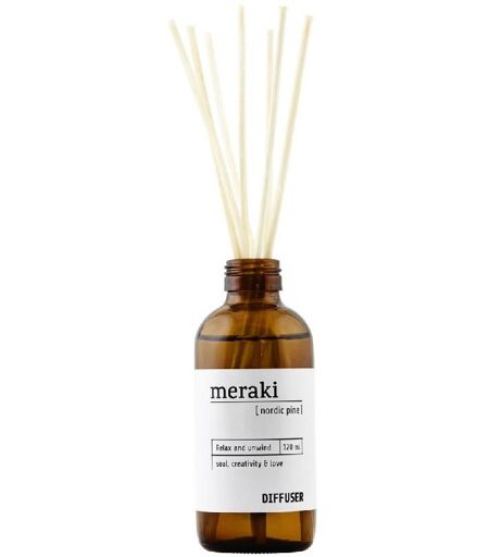 Meraki Nordic Pine Diffuser er en skøn duftfrisker til hjemmet, der kommer med syv pinde. Duften bringer dig på en gåtur i skoven på en varm forårsdag, hvor du kan fornemme hvordan træerne er begyndt at springe ud. Brug Meraki Nordic Pine Diffuser lige der, hvor du ønsker at friske hjemmet op, på badeværelset, i entreen, køkkenet eller stuen. Det mørke, retro og smukke glas, gør Meraki Nordic Pine Diffuser super dekorativ hvor end den stilles i hjemmet. Fordele: Duftfrisker Forførende og frisk duft Duft af skoven og træerne der springer ud Frisk hjemmet op Kommer med 7 pinde Til badeværelset, entreen, køkkenet eller stuen Simpel og flot glasflaske i et mørk glas Dekorativt Anvendelse: Åben flasken og sæt pindene ned i flasken og den er klar Ingrediensliste: Dipropylene glycol monomethy ether, Deionized water and frangrance. ...
