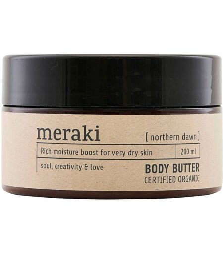 Meraki Body Butter Northern Dawn er fyldig og cremet body creme ideel til en tør og irriteret hud. En blød flødeskumskonsistens smelter ind i huden, efterlader den plejet og beroliget - helt uden at fedte. Den er økologisk certificeret og indeholder økologisk aloe vera og sheasmør samt olier fra mandel, solsikke og oliven. Har du normal eller meget tør hud, vil denne body butter være perfekt til dig. Du skal blot massere cremen blidt ind i huden, og din krop vil straks føles rare. Brug cremen efter behov eller til daglig brug, for at opnå en blød hud. Meraki Body Butter Northern Dawn har en diskret og forfriskende duft der bringer wellness oplevelsen ind på badeværelset. Fordele: Body butter Blød flødeskumskonsistens Smelter ind i huden Indeholder økologisk aloe vera, sheasmør, olier fra mandel, solsikke og oliven Styrker hudens naturlige barriere Diskret og forfriskende duft Wellness oplevelse Velegnet til tør hud og irriteret hud Parabenefri Uden farvestoffer Uden SLS Uden hormonforstyrrende stoffer Kun brug af mild konservering Naturlig parfume - æteriske olier Basisolier af høj kvalitet Eco-Certificeret Vegansk Anvendelse: Påfør på en ren og tør hud Masser en passende mængde ind i huden Ingredienser: Aqua, Aloe Barbadensis Leaf Juice*, Glycerin*, Helianthus Annuus Seed Oil, Cetearyl Alcohol, Oicaprylyl Ether, Glyceryl Stearate, Butyrospermum Parkii Butter, Olea Europaea Fruit Oil, Polyglyceryl-6 Oistearate, Prunus Amygdalus Oulcis Oil, Glyceryl Stearate Citrate, Glyceryl Caprylate, Theobroma Cacao Seed Butter, Sodium Cetearyl Sulfate, Potassium Sorbate, Sodium Benzoate, Sodium Gluconate, Tocopherol, Citric Acid, Parfum, Limonene, Linalool, Geraniol, Citronellol, Citrat. Ingredienser fra økologisk dyrkning. **Ingredienser fremstillet fra økologiske ingredienser. 99,6% naturlig oprindelse af total. 37,7% af de totale ingredienser er fra økologisk dyrkning. ...