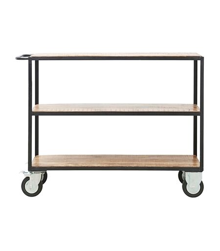 House Doctor Reol m. hjul - Sort/Træ Denne skønne reol på hjul kan placeres overalt i dit hjem og har flere funktioner. Kun fantasien sætter grænser. Møblet er en kombination af et hyldesystem og et rullebord. Brug den for eksempel i køkkenet til opbevaring af køkkenredskaber, i soveværelset til tøj og sko eller i stuen til bøger og dekorationer. Mål: L: 130 cm B: 40 cm H: 98 cm Materiale: Mangotræ/jern ...