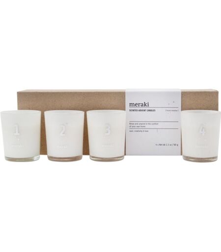 Meraki Scented Advent Candles - Frozen Meadow er en pakke med 4 super fine adventslys, som ikke kan andet end at skabe den perfekte julestemning med både duft og udseende. Disse duftlys har nemlig dejlig, behagelig duft af jul, som mest af alt minder om duften af hjemmebagte pebernødder ude fra køkkenet, mens det smukke sølv-print pynter elegant på de hvide glas. Sæt gang i julestemningen og tæl ned til juleaften hver søndag i advent med de fineste lys fra Meraki. Detaljer: Adventslys (duftlys) 4 x 60 g. H: 6,5, Ø: 5,5 Duft af jul Elegant sølv-print ...