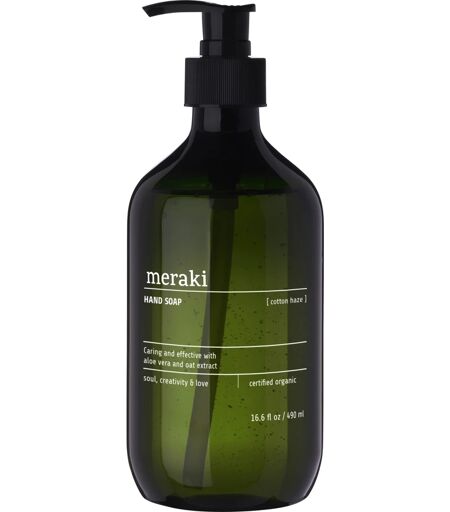 Meraki Hand Soap - Cotton Haze er en certificeret økologisk, flydende håndsæbe, der er designet til at pleje dine hænder ved hver vask, samt forkæle dig med et øjebliks ro. Denne håndsæbe er beriget med aloe vera og olivenbladekstrakt, som blidt renser og blødgør huden, samt efterlader hænderne med en subtil duft, der minder om bomuldsmarker. Den er ideel til daglig brug og sikrer, at dine hænder ikke kun er rene, men også velnærede. Med sit enkle og stilfulde design vil denne håndsæbe tilføje et elegant touch til indretningen på dit badeværelse. Omfavn essensen af naturlig pleje i din badeværelsesrutine med denne skønne håndsæbe. Fordele: Flydende håndsæbe Renser huden blidt Nærer og blødgør huden Ideel til daglig brug Velegnet til alle hudtyper Bomuldsinspireret duft Enkelt og stilfuldt design Ingredienser med 99,2% naturlig oprindelse Økologisk certificeret Anvendelse: Anvendes på fugtede hænder Massér en passende mængde ind i hænderne og skum op Skyl af med vand Bruges efter behov Ingrediensliste: Aqua, Aloe Barbadensis Leaf Juice, Lauryl Glucoside, Sodium Coco-Sulfate, Glycerin, Citric Acid, Sodium Benzoate, Cocamidopropyl Betaine, Sodium Sulfate, Potassium Sorbate, Maris Sal, Sodium Gluconate, Sodium Hydroxide, Sodium Chloride, Avena Sativa Kernel Extract, Eriophorum Spissum Flower/Stem Extract, Sorbic Acid, Parfum, Limonene, Benzyl Benzoate, Linalool. ...