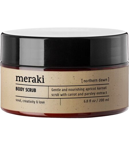 Meraki Body Scrub - Northern Dawn er en mild og nærende bodyscrub, som forkæler din hud med sanserig pleje, som forvandler dit bad til et øjeblik af velvære. Denne bodyscrub er beriget med bløde, naturlige eksfolierende korn og ekstrakt fra gulerod og persille, som sammen plejer og genopliver huden, samtidig med at du kan nyde duften af modne abrikoser. Massér den ind i våd hud for at opnå en følelse af blødhed og revitalisering. Perfekt til morgenrutinen eller som et luksuriøst indslag efter en lang dag. Giv din hud fornyet glød og en eksklusiv spa-følelse hjemme. Fordele: Bodyscrub Naturlige eksfolierende korn Duftnoter af abrikos Plejer og blødgør huden Revitaliserer og giver huden glød Til alle hudtyper Enkelt og stilfuldt design Ingredienser med 95% naturlig oprindelse Anvendelse: Anvendes på fugtet hud i brusebadet Massér en passende mængde ind i huden med cirkulære bevægelser Skyl grundigt af Afslut med en bodylotion for at tilføre huden ekstra fugt Bruges 1-2 gange om ugen Ingrediensliste: Aqua, Aloe Barbadensis Leaf Juice, Prunus Armeniaca Seed Powder, Sodium Laureth Sulfate, Glycerin, Acrylates/C10-30 Alkyl Acrylate Crosspolymer, Sodium Cocoamphoacetate, Phenoxyethanol, Citric Acid, Sodium Hydroxide, PEG-4 Rapeseedamide, Sodium Benzoate, Sodium Chloride, Potassium Sorbate, Sodium Gluconate, Daucus Carota Sativa Root Extract, Carum Petroselinum Extract, Parfum, Limonene, Citrus Aurantium Amara Flower Oil, Cedrus Atlantica Bark Extract, Pogostemon Cablin Oil, Lavandula Hybrida Extract, Linalool, Linalyl Acetate, Citrus Aurantium Bergamia Peel Oil, Citrus Limon Peel, Geraniol. 95% natural origin of total. 16% of the total ingredients are from organic farming. ...