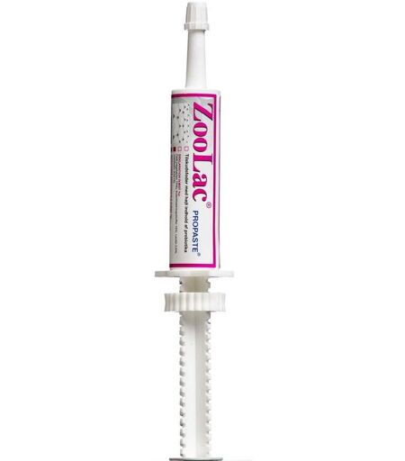 ZooLac Propaste er en bakteriel pasta til regulering af bakteriefloraen i mave- og tarmkanalen hos alle dyrearter. Pastaen kan bruges ved akut diarré eller til forebyggelse af mave- og tarmforstyrrelser, der kan opstå ved f.eks. foderskift eller stressende omstændigheder. Pastaen leveres i en sprøjte, der kan indstilles til den ønskede mængde. Anvendelse: Pastaen placeres direkte på dyrets tunge eller oven på foderet hver 6.-8. time, indtil ønsket virkning opnås. ...