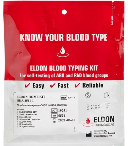 Eldon Blodtypetest er en dansk opfindelse, som har eksisteret siden 1959. Det kan være en god ide at kende sin blodtype, hvis man skulle komme ud for en ulykke, eller hvis man bare vil tilpasse sin kost efter blodtypen. Eldon Blodtypetest er med til at bestemme blodtypen ud fra de antigener, der er på overfladen af de røde blodceller, eller hvis der er antistof til stede i blodprøven. Bemærkning Bør ikke bruges af personer med hæmofili eller personer, som tager blodfortyndende medicin (anti.koagulanter)Et lille antal personer har svage D-antigener på blodcellerne, og agglutinationer kan måske ikke ses. Kun specialiserede laboratorier kan påvise sådanne svage D-antigener med sikkerhed.Der kan i sjældne tilfælde opstå uspecifikke agglutinationer ved tilstedeværelse af visse proteiner. Hvis dette er tilfældet, er agglutinationen også synlig i kontrolfeltet, hvilket betyder et ugyldigt resultat, og der bør foretages en ny test. Måske kan din blodtype bestemmes i et særligt laboratorium.Opbevares uden for børns rækkevidde.Når resultatet er kendt, læg alle brugte ting tilbage i den originale æske og bortskaf æsken med almindeligt husholdningsaffald. ...