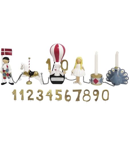 Fødselsdagstog med Harlekin og ColumbineGlæd barnet med det eventyrlig smukke fødselsdagstogFødselsdagstoget med Harlekin og Columbine er fra det danske firma, Kids by Friis. Dæk det fineste og sødeste fødselsdagsbordet med det detaljerede fødselsdagstog. Fødselsdagstoget er håndlavet og håndmalet, og består af Harlekin, der trækker toget med hesten fra Tivoli karusellen. Dernæst kommer pjerot i ballongyngen, hvorpå man kan skrive barnet alder med en tusch. Så kommer Columbine, trommen og den ikoniske påfugl fra Tivoli's smukke pantomime teatret. Der medfølger 11 tal lys, så man rigtig kan fejre barnet fødselsdag. Materialer: Fødselsdagstoget er i 50 pct. kalcium karbonat (hvidt stenpulver) og 50 pct. poly-resin.OBS: De to runde lys som er vist på billedet samt tusch medfølger ikke. Lys og tusch kan købes seperat. ...