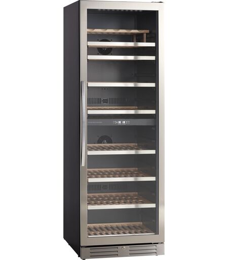 Scandomestic SV 124 X Vinkøleskab, stål SV 124 X kan bruges til både indbygning og som fritstående vinskab. Skabet har to zoner, kan indstilles mellem 5°C – 18°C uafhængigt af hinanden. Skabet kan rumme 126 flasker fordelt på 7 1/2 hylder i bøgetræ, heraf 6 udtrækshylder og 1 1/2 stationær. Et flot skab til opbevaring af dine flasker. Skabet har et tidløst design, hvor den sorte rammeløse glasdør og det indvendige lys giver skabet et eksklusivt udtryk. Højre hængslet dør med mulighed for dørvending, så det altid er fleksibelt at placere vinskabet i rummet. 2 horisontale LED lys giver et godt lys og repræsenterer vinen flot. Skabet har intelligent luftcirkulationssystem, som sikrer perfekt ventileret, anti-vibrationskøling i hele skabet. SV 124 X har UV-beskyttelse, er elektronisk styret og har digitalt kontrolpanel, så det er nemt at se og justere temperaturen i skabet. Specifikationer: Produkttype: Vinkøleskab Farve: Stål Flaskekapacitet: 126 Temperaturzoner: 2 Temperatur: 5-18 °C Antal hylder: 7 Kapacitet: 416 liter Støjniveau: 39 dBA Strøm: 230V/50Hz Energiklasse: G Klimaklasse: N/ST Produktmål (HxBxD): 176,4 x 59,5 x 68 cm Vægt: 94 kg ...