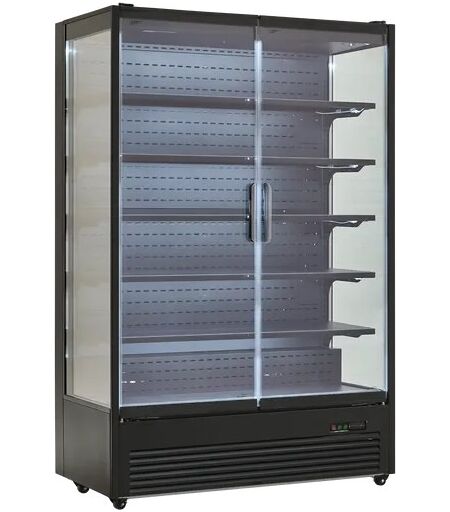 Scandomestic MDC1290BB - Displaykøleskab, sort MDC1290BB er et stort 2-dørs multideck-køleskab med 764 nettoliter køleplads. Med en komplet glasdør og glasgavl er køleren eminent til impulssalg og fremhæver produkter på bedste vis. De 5 hylder kan indstilles i mange niveauer, så flasker, dåser og andre ting står stabilt og pænt repræsenteret i køleren. Multideck-køleskabe bruges i butikker, supermarkeder, caféer, restauranter, pizzeriaer, tankstationer m.m. og er meget velegnede til selvbetjening, hvilket giver en god mulighed for at placere skabet strategisk for at skabe fokus og mersalg. Leveres med 5 sorte, stærke hylder, som kan rumme op til 89 kg pr. hylde. Hylderne kan desuden justeres i mange niveauer og har vippefunktion (0°/7°/14°) Køleskabet har hængslede og selvlukkende døre, som altid minimerer temperaturstigninger. Køleskabet har rigtig god belysning med 2 vandrette energibesparende LED-lys i toppen og ekstra LED-lys under hver hylde, så køleskabet præsenterer varerne flot. Køleskabet har en ventilator, som sikrer perfekt ventileret køling i hele køleskabet. MDC1290BB er elektronisk styret og har et eksternt digitalt kontrolpanel, så det er nemt at se og justere temperaturen i skabet. Specifikationer: Produktmål, HxBxD, mm: 2010 x 1310 x 740 Bruttovolume, ltr: 1292 Klimaklasse: 3 Luftfugtighedsområde (%RH): 60 Brand: Scancool Fuldt gennemsigtig glasdør og endevæg for ultimativt udsyn Selvlukkende rammeløse glasdøre 5 niveauer af hylder med LED-lys under hver hylde Justerbare hylder med vippefunktion (0°/7°/14°) Digital temperaturvisning - temperaturområde +1/+5°C Ventileret køling LED-lys i toppen af skabet ...