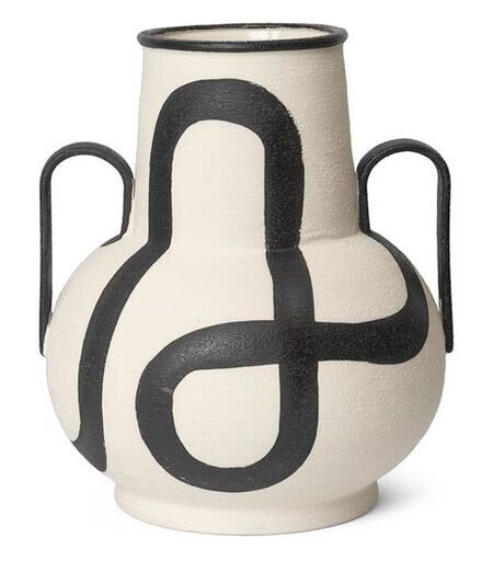 Ferm Living Trace Vase H: 37,5 cm - Off-White Trace vasen fra Ferm Living er en elegant vase i Ferms ånd. Trace har smukke, runde former, en flot håndmålet linje samt store, sorte håndtag som strækker sig ned til linjerne. Vasen har en kornet overflade og er fremstillet af stentøj. Vasen størrelse gør den ideel til brug som gulvvase. Designer: Ferm Living Materialer: Stentøj Mål: Højde: 37,5 cm Bredde: 33,5 cm Dybde: 32,5 cm Farve: Off-White Rengøring og vedligeholdelse: Rens med lunkent vand ...