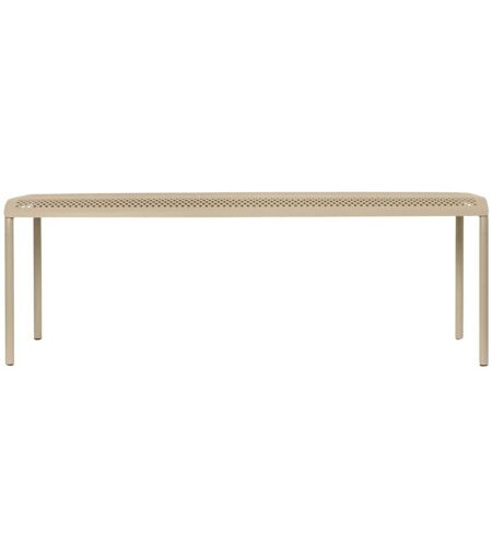 Ferm Living Dapple Bænk B: 130 cm - Cashmere Dapple-kollektionen er skabt med inspiration fra sollysets leg gennem bladene, der skaber en beroligende stemning i udemiljøet. Dapple Bænken er lavet af pulverlakeret, galvaniseret stål, som giver lang holdbarhed og beskytter mod vejrets påvirkninger, samtidig med at den udstråler en sofistikeret æstetik. Med sin lette og luftige form samt det unikke perforerede mønster forener Dapple Bænken funktionalitet og elegance. Mål: H: 45 cm B: 130 cm D: 39,8 cm Vægt: 10,5 kg Farve: Beige Materiale: Galvaniseret stål med udendørs pulverlakering Vedligeholdelse: Tør af med en fugtig klud. ...