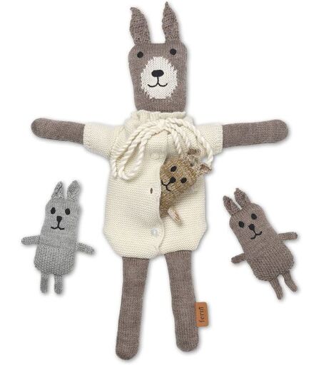 Ferm Living Lee Merino Rabbit Family H: 40 cm Lille samling af søde kaniner i merinould fra Ferm Living, som med garanti vil bringe glæde og smil frem ind i hverdagen for dit barn. Den store kanin har en knappet kjole på, der rummer en lille overraskelse, hvor tre kaninunger ligger trygt og varmt derinde. Lee Rabbit Family har et klassisk, varmt og hyggeligt udtryk og er strikket i det blødeste merinould fra New Zealand med fyld af genanvendt polyester. Design: Ferm Living Materiale: 100% merinould Fyld: Genbrugt polyester Mål: B: 25 cm H: 40 cm D: 5 cm Plejeanvisning: Tørres af med fugtig klud. ...