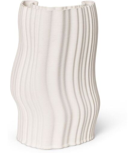 Ferm Living Moire Vase H: 30 cm - Off White Den meget smukke og elegante vase fra Ferm Living er perfekt til at vise dine yndlingsblomster eller grene frem eller blot benytte den som et statement i sig selv. Moire udspringer sig af det franske og betyder "bølgeformet". I processen er der blevet benyttet 3D-printning af ler, der har resulteret i tynde lag, som har dannet det flotte mønster henover vasen. Design: Ferm Living Mål: H: 30 cm B: 19 cm D: 12 cm Materiale: Keramik ...