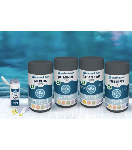 Den perfekte startpakke til spabadetDette startsæt indeholder alle de plejemidler, der er nødvendige for at holde vandet i spabadet rent og indbydende. Sættet indeholder CleanTabs, der er en hurtigopløsning, pH-neutral tablet til desinfektion af vandet. Spa Test Strips brugt til at teste pH værdien og klorindhold, resultatet kan aflæses på beholderen. Spa pH-Plus og Spa pH-Minus bruges til at justere pH-niveauet, hvis det ikke ligger med de ønskede 7,0-7,4. Filterfix til effektiv rengøring af spabadets filter, så små urenheder ikke tilstopper filteret. Lomax anbefaler, at filteret rengøres ca. hver anden til tredje uge. Sørg for, at kemikalier ikke bliver fugtige under opbevaring. Opbevares i originalforpakning, aflåst og utilgængeligt for børn, samt tørt, frostfrit og ikke i direkte sollys. Sundt poolvand har en pH-værdi på mellem 7,0 og 7,4Optimalt klor indhold ligger mellem 2,0 – 3,0 mg/l.Sættet indeholder: Cleantabs, teststrips, pH plus, pH minus, filterrengøring, vejledning ...