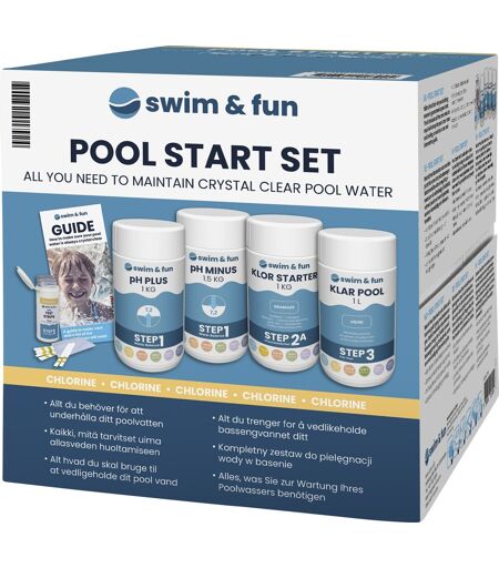 Startpakken med de vigtigste plejemidler Denne pakke indeholder alle de plejemidler der er nødvendige for at holde vandet i poolen rent og indbydende. Sættet indeholder Klor Starter til desinfektion af vandet, test ttrips til nemt at teste pH værdi og klorindhold, pH-Plus og pH-Minus til at justere pH-niveauet og KlarPool til forebyggelse af belægninger.Klor starter benyttes primært til når poolen lige er blevet fyldt eller hvis, der opstår problemer med poolens vand, der kræver en højere mængde desinfektionsmiddel. Klor starter er tæt på pH-neutral og stabiliseret mod klornedbrydning fra solens UV-stråler. Sundt poolvand har en pH-værdi på mellem 7,0 og 7,4. En sund vandbalance giver den bedste nyttevirkning af vandplejemidler. Hvis vandet i din swimmingpool eller spabad er for hårdt, så anvendes pH-minus til at sænke den. Hvis vandet er for blødt anvendes pH-plus. KlarPool holder vandet klart ved at forebygge udviklingen af mikroorganismer som kan danne belægninger i poolen.Indhold: Klor starter, teststrimler, pH minus, pH plus og klarpool Optimalt klorindhold: 0,5 - 1,0 mg/l Optimal pH-værdi: 7,0-7,4.Kontrollér og justér regelmæssigt klor og pH-niveauet med test stripsPoolvandets indhold af klorstabilisator (cyanursyre) må ikke overstige 100 mg/l.overskuelig og informativ guide.Husk, at det skal opbevares i originalforpakning, aflåst og utilgængeligt for børn, samt tørt frostfrit og ikke i direkte sollys. ...