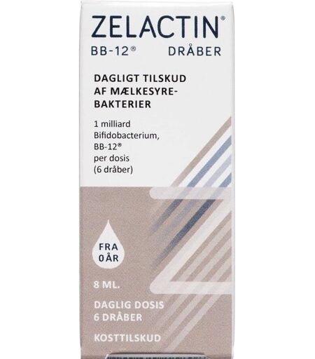 Zelactin BB-12 Dråber er et dagligt tilskud af mælkesyrebakterier. Mælkesyrebakterierne Bifidobacterium BB-12 i Zelactin, tåler mave- og galdesyre. Dispenseringsform Dråber. Dosis og anvendelse Dråberne kan indtages som de er, eller blandes med drikke, som har en temperatur på maksimalt 37 grader. Ryst kraftigt før brug til alt pulver er opløst. ...