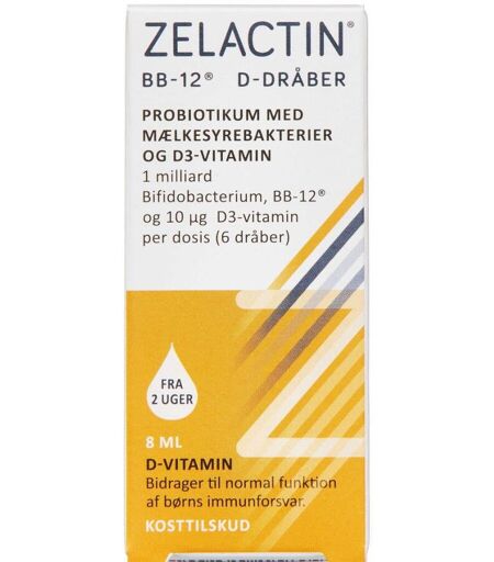 Zelactin BB-12 D-dråber er et probiotikum med mælkesyrebakterier og D3-vitamin. D-vitamin bidrager til børns normale vækst og knogleudvikling. Dispenseringsform Flydende Dosis og Anvendelse Anbefalet daglig dosis: 6 dråber Anbefalet daglig dosis bør ikke overskrides. Dråberne kan indtages som de er, eller blandes med kolde drikke. Ryst flasken kraftigt før brug til alt pulver er opløst. Flasken holdes lodret indtil dråberne drypper ud. Mælkesyrebakterierne er synlige i olien. ...