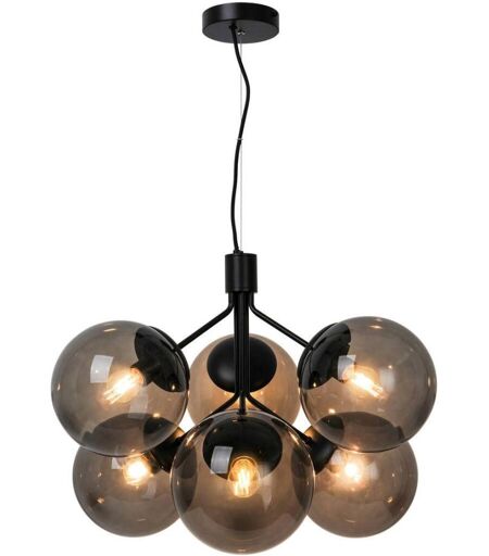 Nordlux Ivona 6 Pendel - Sort Ivona lampen er et moderne take på den klassiske lysekrone, med et industrielt look. Lampens seks glaskugler udsender et smukt spredt lys og er med til at skabe en moderne stil og et ekstravagant udtryk. Det sorte stål koblet med det røgede glas giver lampens karakteristiske og enestående udseende. Designere: Says Who Mål: H: 44,5 cm L: 62 cm B: 62 cm Materialer: Metal Glas Lyskilde: 6x E27 Max 28W (pærer medfølger ikke) Spænding: 230V Tekniske specifikationer: IP20 (kun til indendørs brug) Klasse 2 (Dobbelt isoleret) Ledning: 2 m stofledning (kan ikke skiftes) Farver: Lampefarve: Sort Ledning: Sort stofledning ...