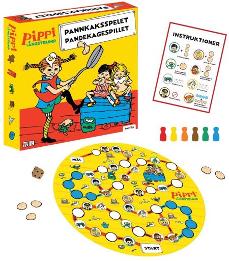 Pippi och hennes vänner älskar pannkakor och de kan äta mycket. Nu måste du hjälpa till att samla ihop pannkakor till en trevlig festmiddag. I spelet kommer du att stöta på möjligheter som växelvis ger dig pannkakor och äter de du redan har. Vinnaren är den som har det högsta pannkakstornet i slutet. Innehåll: Spelplan, 4 tallriksbitar, 4 spelbitar, 100 pannkaksbitar, 1 tärning, 1 uppsättning spelregler. Storlek på låda: 34×4,5×24 cm. Rekommenderad ålder: Från 4 år Antal spelare: 2-4 ...