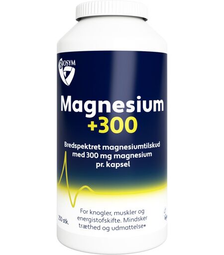 Biosym Magnesium +300 er et bredspektret magnesiumtilskud med 300 mg magnesium pr. kapsel. Magnesium +300 ...