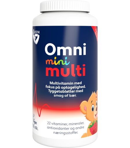 Biosym OmniMini Multivitamin er en børnevenlig og velsmagende multivitamin til børn fra 3-10 år med naturlig smag af kirsebær, jordbær og hindbær og ...