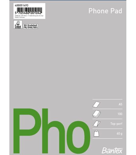 Bantex telefonblok med stub Blank blok som er hæftet i toppen, og samlet med blå lærredstape. Tapen forstærker blokken, og skjuler hæfteklammerne. Blokken indeholder 100 ark papir som er svanemærket. Hvert ark har en mikroperforering, som gør det nemt at afrive siderne, og som giver en renskåret kant. Blank blok Format: A5 Farve: Hvid Uden huller Papirtype: 60 gram 100 ark pr. blok ...