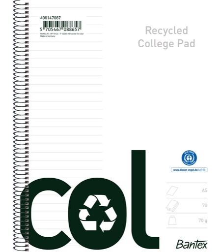 Bantex Recycled Kollegieblok Bantex Recycled Col kollegieblokke er miljøcertificerede papirblokke af 100% genanvendt papir, med praktisk omslag og spiralryg. Spiralblokken er udviklet til både studerende, hjemmebrug og brug på kontoret og arbejdspladsen. Blokken indeholder mikroperforerede sider med en speciel udstansning i top og bund, der sikrer en perfekt afrivning af den enkelte side. Det genanvendte papir har en god kvalitet, der er velegnet til alle primære skriveredskaber. Linjeret Format: A5+ Papirkvalitet: 70 g 70 blade Mikroperforering til afrivning Blue Angel ...