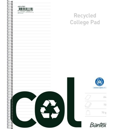 Bantex Recycled Kollegieblok Bantex Recycled Col kollegieblokke er miljøcertificerede papirblokke af 100% genanvendt papir, med praktisk omslag og spiralryg. Spiralblokken er udviklet til både studerende, hjemmebrug og brug på kontoret og arbejdspladsen. Blokken indeholder mikroperforerede sider med en speciel udstansning i top og bund, der sikrer en perfekt afrivning af den enkelte side. Det genanvendte papir har en god kvalitet, der er velegnet til alle primære skriveredskaber. Linjeret Format: A4+ Papirkvalitet: 70 g 70 blade Mikroperforering til afrivning Blue Angel ...