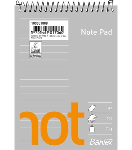 Bantex Not Spiralblok med linjeret papir Denne Bantex notesblok i A6-format er perfekt til mødenoter, huskelister og daglige opgaver. Det kompakte format giver masser af skriveplads, samtidig med at blokken er nem at have med i tasken eller opbevare på skrivebordet. Desuden er blokken certificeret med EU-Blomsten, hvilket er din garanti for, at produktet lever op til skrappe krav inden for produktion og kvalitet. Format: A6 Papirkvalitet: 70 g Arkinddeling: Linjeret Antal ark pr. blok: 100 Med mikroperforering Uden huller Certificeret med EU-blomsten Holdbar notesblok til fleksibel brug Notesblokken er udstyret med en kraftig wire-o topspiral, der sikrer lang holdbarhed og forhindrer, at spiralen sætter sig fast i lommer eller tasker. Det ekstra kraftige bagpap giver et stabilt underlag, så du nemt kan skrive i frihånd. Praktisk spiralblok til noter og kladder Den smarte lille notesblok er god til både studerende, hjemmebrug og på arbejdspladsen. Blokken er med linjeret papir og holdes sammen af en spiral i toppen af blokken, så du nemt kan vende siderne i blokken, når en ny side skal tages i brug. Standardblok med nem afrivning Du får her en god standardblok som er perfekt til kladde- og notespapir og papiret har samtidig en praktisk mikroperforering, som giver dig en perfekt afrevet kant. Et godt valg til det daglige behov for skrivepapir. ...