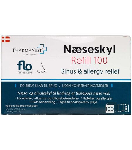 FLO Næseskyl Refill anvendes sammen med FLO Sinus Care skylleflasken, som findes i FLO Næseskyl Startersæt. FLO Næseskyl Startersæt er et ikke-receptpligtigt sæt uden konserveringsmidler til skylning af næse og bihuler. Det kan bruges til at lindre ved tilstoppet næse og bihuler samt til at fremme restitutionen efter næse- og bihuleoperationer. Bemærkning Anvend ikke op til 1 time før sengetid.Må anvendes af gravide og ammende. ...