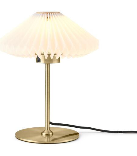 Elegant bordlampe med smukke plisseringer Paris bordlampen fra danske Halo Design er en smuk bordlampe med smukke plisseringer, der tilføjer elegance og eksklusivitet. Lampen er stærkt inspireret af det parisiske modebillede og netop de smukke plisseringer er tendenser, man kan forestille sig på catwalkene i Paris og i det pulserende gadebillede.Lampen spreder stilfuldt lyset med sin diameter på 24 cm og den er med G9 fatning, der giver rig mulig for at sætte netop den stemning man ønsker. Farve: Hvid/messing Mål (ØxH): 24 x 32 cm Materiale: Metal og plast Fatning: G9 Maks. Watt: 28W Lyskilde inkluderet: Nej Ledning: 150 cm sort ledning ...