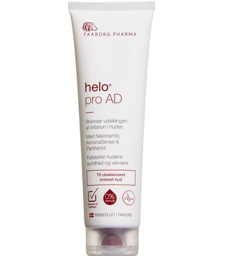 Faaborg Helo Pro AD er en creme til svære tilfælde af meget irriteret hud. Stopper udviklingen af irritation og kløende hud med Annonasense. Hjælper huden med at genfinde sin egen evne til at hele. Niacinamid (vitamin B3) booster hudens eget forsvar. Probiotika styrker hudens egen bakterieflora. Kokosolie er rig på E-vitamin og virker beskyttende, fugtgivende og blødgørende. Forstærker hudens naturlige elasticitet. Panthenol (vitamin B5) fremskynder den naturlige opheling, virker fugtbindende og mindsker fugttab i huden. Helo-serien er effektive og samtidig milde og skånsomme produkter, der fugter, genopbygger og plejer meget tør og følsom hud. Produceret i den sydfynske kødstad Faaborg. Faaborg Helo Pro AD er AllergyCertified, parfumefri og anbefalet af hudlæger. Fedtindhold: 44%. Dosis og Anvendelse Faaborg Helo Pro AD bør anvendes flere gange om dagen efter behov i 1-2 uger, for herefter at anvende en fed creme som helo creme eller helo anti-itch 70% for at genoprette hudens naturlige balance. ...