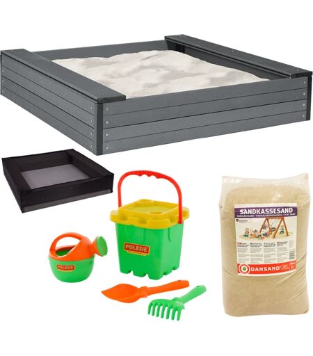 Denne sandkasse fra NORDIC PLAY måler 120 x 120 cm og leveres komplet med 240 kg dansk kvartssand, et finmasket net og klassisk sandkasselegetøj. Den er fremstillet i vedligeholdelsesfri WPC-komposit og har siddebrædder hele vejen rundt, som giver børnene komfort og støtte under legen. En komplet og pladsbesparende løsning til haven eller terrassen. De vigtigste fordele: Kompakt sandkasse i vedligeholdelsesfri WPC Finmasket net beskytter mod blade og dyr Siddebrædder på alle fire sider Legetøj medfølger: spand med si, skovl, rive og vandkande Inkl. 240 kg certificeret kvartssand fra Dansand Kræver ingen behandling eller vedligehold Leveres usamlet med samlevejledning og skruer Klar til leg fra dag ét Med både sand, legetøj og net med i pakken er sættet klar til brug kort efter samling. Det kompakte format passer godt i mindre haver og skaber et hyggeligt samlingspunkt hvor børnene kan bygge, grave og lege sammen. Robust og vedligeholdelsesfrit design WPC kombinerer træets udtryk med plastens holdbarhed. Materialet er vejrbestandigt og kræver ingen olie eller maling. Det medfølgende sand er certificeret kvartssand fra Dansand, opgravet og siet i Danmark helt uden tilsætningsstoffer. Specifikationer: Indhold: Sandkasse, 240 kg sand (12 x 20 kg sække), sandkassenet, sandkasselegetøj Farve: Grå Materiale: Komposit (WPC) Udvendige mål (HxBxD): 24 x 120 x 120 cm Vægt: 262 kg Certificeringer: Certificeret sand fra Dansand Leveres usamlet med samlevejledning og skruer ...