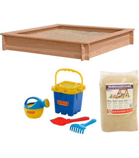 Dette sæt fra NORDIC PLAY kombinerer en stor sandkasse i ubehandlet lærketræ med certificeret kvartssand og klassisk sandkasselegetøj. Det naturlige design passer ind i de fleste haver og skaber de perfekte rammer for sjov, samvær og fantasifuld leg i det fri. De vigtigste fordele: Alt samlet i én praktisk pakke Stor sandkasse i lærketræ (150 x 150 cm) Inkl. 240 kg certificeret dansk kvartssand fra Dansand Spand med si, skovl, rive og vandkande medfølger Holdbare materialer der egner sig til udendørs brug PEFC-certificeret træ Leveres usamlet med samlevejledning og skruer Plads til både fantasi og fællesskab Sandkassen har masser af plads til at flere børn kan lege side om side og skabe sandslotte, veje eller figurer. Legetøjet gør det nemt at komme i gang og indbyder til både leg alene og sammen med andre. Rent sand og naturlige materialer Sandet fra Dansand er opgravet, vasket og siet i Danmark og leveres helt uden tilsætningsstoffer. Det ubehandlede lærketræ er kendt for sin holdbarhed og naturlige modstandsdygtighed mod vind og vejr og kan efterbehandles om ønsket. Specifikationer: Indhold: Sandkasse, 240 kg sand (12 x 20 kg sække), sandkasselegetøj Materiale: Ubehandlet lærketræ Udvendige mål (HxBxD): 25 x 150 x 150 cm Vægt: 265 kg Certificeringer: PEFC (PBN-PEFC-COC-015547), certificeret sand fra Dansand ...