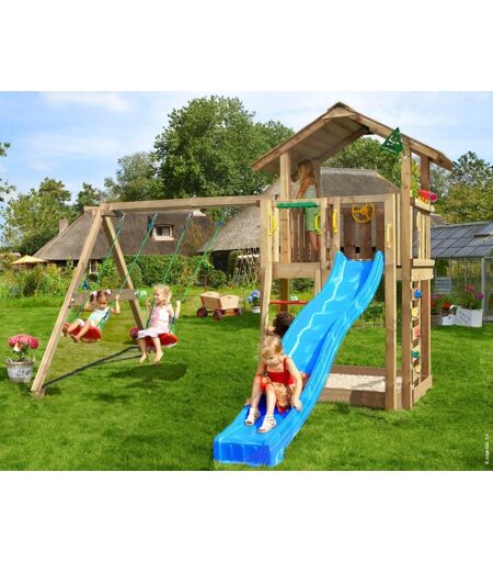 Jungle Gym Chalet 2.1 legetårn med gynger, blå rutsjebane og sand Jungle Gym Chalet kan godt minde om farlige eventyr i de schweiziske alper. Tårnet har en spændende opbygning med mange stimulerende muligheder. Den fremskudte "balkon" er perfekt til solskinsvejr, og der er mulighed for, at børnene altid kan finde på noget nyt at lege. Jungle Chalet har træ tag med en ståhøjde på over 145 cm og ser imponerende ud i haven. I bunden af legetårnet findes en sandkasse, som er placeret i skygge og hvor flotte sandslotte kan tage form. Legetårnet er inklusiv det poplære Swing modul Xtra, som kan give selv de vildeste børn et sus i maven. Inklusiv gyngemodul med 2 gynger, stjernekikkert, Rock modul, 5 stk. klatresten, rat, blå rutsjebane 265 cm og sandkasse samt 120 kg certificeret sandkassesand leveret i 6 poser af 20 kg. Legetårnet består af trykimprægneret fyrretræ. Testet og overvåget for kvalitet og sikkerhed (i henhold til EN: 71-1, 2, 3, 8 & 9) CE godkendt. Legetårnet leveres som komplet saml-selv-pakke i færdigsavede trælængder. Det er tungt og leveres derfor på din adresse med fragtbil. Dimensioner (HxBxD): 315 x 403 x 428 cm Sikkerhedsafstand tårn: 200 cm Sikkerhedsafstand gyngestativ: 225 cm Stolper: 68 x 68 / 88 x 88 mm Reglar: 34 x 58 mm Brædder: 16 x 95 mm Maks brugere: 11 personer Maks brugervægt pr. person: 50 kg. PEFC-certificeret ...