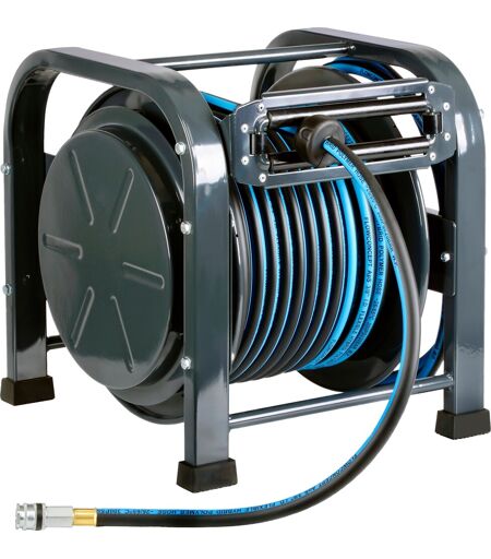 Automatisk slangeopruller med monteret PUR slangeDen automatiske slangeopruller til luft er monteret med faste ben som sikre en solid placering af holderen. Selve oprulleren er fremstillet i kraftigt pulverlakeret stålstel og udstyret med automatisk låsefunktion, der gør du at let kan låse kablet i den ønskede længde.Den påmonterede slange er en yderst fleksibel og kraftfuld PUR armerede slange, som er resistent overfor et stort udvalg af kemikalier. Herpå er monteret kobling og nippel, så den nemt kan kobles sammen med f.eks. en trykpistol.Mærke: FlowconceptMedie: LuftDimension: 9,5/13 mmLængde på slange: 30 meterSlangens materiale: PURTotal vægt: 16 kgMax tryk: 16 barTilslutning: Nippel Afgang: Kobling ...