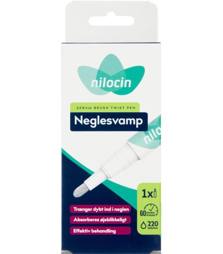 Nilocin Neglesvamp Brust Twist Pen bruges til behandling af neglesvamp på finger- og tånegle samt til neglemisfarvninger og neglepleje. Nilocin Serum trænger ned i neglen og virker ved at fjerne betingelserne for svampens overlevelse. Bemærkning Kun til udvortes brug.Må ikke anvendes til børn under 8 år, med mindre ordineret af læge.Diabetikere anbefales at konsultere læge inden brug.Brug ikke Nilocin hvis du er overfølsom over for indholdsstofferne.Undgå kontakt med sund hud omkring negleområdet når serum påføres.Nilocin Serum Pen er specielt designet til direkte applicering på negle. Må ikke anvendes på andre dele af kroppen, herunder øjne eller slimhinder.Overskrid ikke antallet af anbefalede applikationer.I tilfælde af en allergisk reaktion eller irritation, ophør brug af produktet. Dosis og Anvendelse Sådan bruges Nilocin: Fjern hætten fra Nilocin-pennen.FØRSTE GANG: Drej pennens top, indtil der kommer væske på penslen. Drej langsomt og sørg for ikke at påføre for meget væske. Det kan kræve mange drejninger for aktivering første gang.DEREFTER: Drej pennens top, når du har brug for mere væske.Påfør serummet på de berørte negle med penslen. Sørg for at dække hele neglens overflade og undgå kontakt med den omgivende sunde hud.Lad opløsningen trænge helt ind i neglen (1-5 minutter afhængig af mængden af påført væske).Gentag denne procedure to gange dagligt f.eks. morgen og aften.Efter 3-4 uger kan påføringen reduceres til én gang dagligt, indtil en ny sund negl er vokset ud igen.Til forbyggende brug påføres væsken én gang dagligt ugentligt. Neglelak skal altid fjernes inden påføring. Neglelakken kan genpåføres efter behandling. Kan anvendes op til 12 måneder efter første brug, hvorefter pennen skal bortskaffes. ...