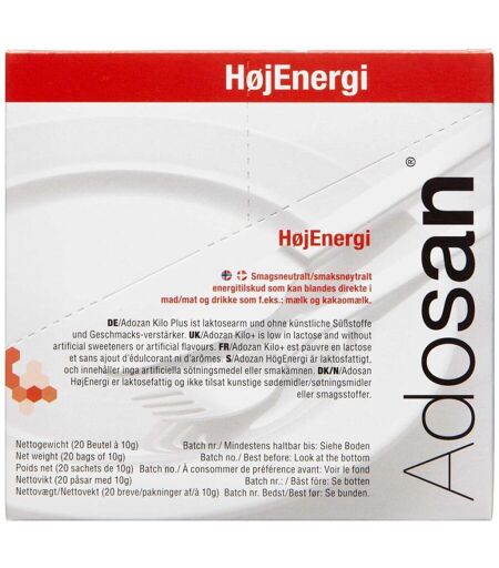 Adozan Pulver HøjEnergi 20 x 10 g Adozan HøjEnergi er et smagsneutralt energitilskud i pulverform, som tilsættes maden. Adozan HøjEnergi har en høj fedtenergiprocent og er velegnet til hoved- og mellemmåltider, morgenmad, yoghurt eller andre retter, hvis energitætheden skal forøges. Adozan HøjEnergi er ikke tilsat kunstige sødemidler eller smagsstoffer. Adozan er tidligere kendt som Adosan. Dispenseringsform Pulver. Dosis og anvendelse Et brev kan blandes med 125 ml mad eller drikke. Adozan HøjEnergi kan blandes i kolde og varme retter og er frysestabil. ...