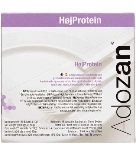 Adozan Pulver HøjProtein 20 x 10 g Adozan Pulver HøjProtein er et smagsneutralt proteintilskud i pulverform. Adozan er tidligere kendt som Adosan. Dispenseringsform Pulver. Dosis og anvendelse Et brev kan blandes med 125 ml mad eller drikke. Adozan HøjProtein kan blandes i kolde og varme retter og er frysestabil. Kan også blandes i drikke, som f.eks. mælk, saftevand eller juice. ...