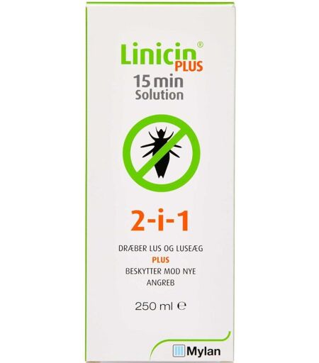 Linicin Plus Solution forebygger og behandler nye luseangreb i op til 3 dage efter behandlingen. Desuden er Linicin Plus Solution lugtfri og farveløs. Bemærkning Kan anvendes af voksne og børn fra 12 måneder.Undgå at få Linicin Plus Solution i øjnene.Linicin Plus Solution er kun til udvortes brug.Stop behandling med Linicin Plus Solution, hvis der opstår hududslæt eller overfølsomhed.Opbevares ved stuetemperatur og utilgængeligt for børn. ...