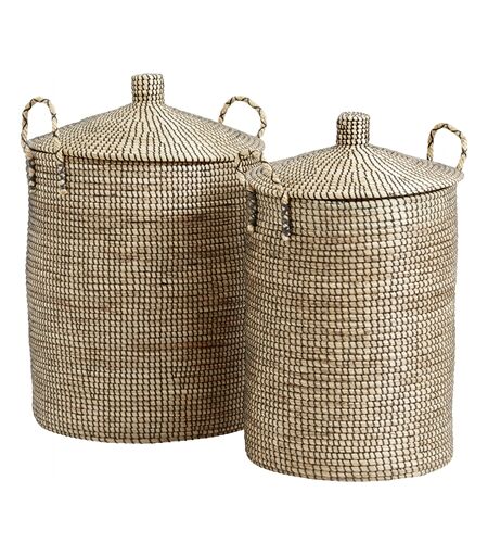 Nordal LAUDY Vasketøjskurve Sæt m 2 stk - Natur / Sort Sæt med to smukke og charmerende vasketøjskurve fra Nordal. Kurvene er lavet af søgræs, som er flettet sammen med sort snor. De fine kurve har flotte låg samt håndtag i siderne, som gør det nemt at flytte og transportere dem. Idet kurvene har låg kan vasketøjet nemt gemmes af vejen. Brug kurvene til opbevaring af vasketøj, plaider, puder mv. Med sit charmerende design vil vasketøjskurvene tilføje en smuk detalje til enhver indretning. Sættet består af to vasketøjskurve i forskellige størrelser - den ene er 60 cm høj og den anden er 55 cm høj. OBS: Da kurvene er delvist håndlavede, kan variationer i farve, finish og størrelse forekomme, hvilket er en del af kurvenes unikke look. Design: Nordal Materiale: Søgræs Mål: Stor kurv: H: 60 cm Ø: 48 cm Lille kurv: H: 55 cm Ø: 41 cm Nettovægt: 10 kg ...
