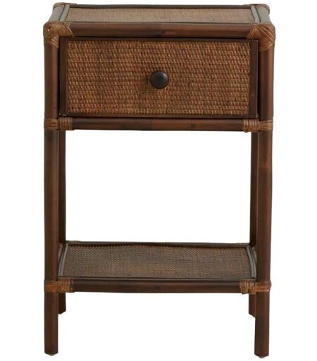 Nordal HAYES Sidebord/Sengebord 44x35 cm - Brun Smukt bord HAYES fra Nordal. Bordet kan bruges som både sidebord og natbord. Det praktiske bord er udstyret med en skuffe og en hylde fremstillet af rattan og har flet på top, skuffe og hylde. Bordets varme brune farve giver plads til indretningsmuligheder, og passer til mange forskellige stile. Da rattan er et naturmateriale vil variationer i farven forekomme, og derfor vil hvert bord være en smule unik. Designer: Nordal Materiale: Rattan Mål: Højde: 65 cm Bredde: 44 cm Dybde: 35 cm Vægt: 3 kg Farve: Brun ...
