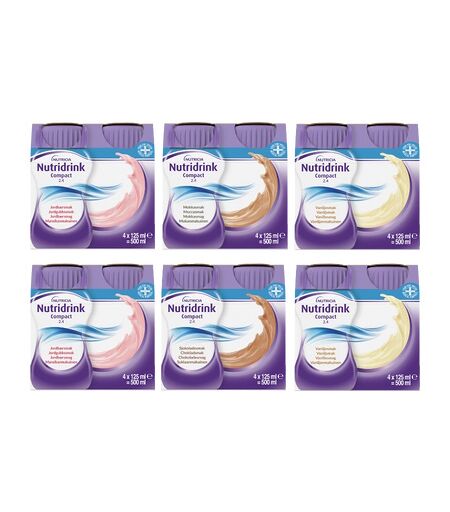 Nutridrink Compact er en fuldgyldig ernæringsdrik med en energitæthed på 2,4 kcal/ml. Indholdet i Nutridrink Compact (125 ml) svarer til næringsindholdet i en almindelig energirig ernæringsdrik (200 ml). Dette gør Nutridrink Compact særdeles velegnet til patienter, som har vanskeligt ved at drikke hele indholdet af en standard ernæringsdrik. Andre pakningsstørrelser Nutridrink Compact findes i 8 forskellige smagsvarianter: banan, jordbær, mokka, vanilje, skovbær, abrikos, chokolade og neutral. Dispenseringsform Ernæringsdrik ...